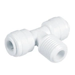 Biała złączka DMfit AMTU040404W typu trójnik wyposażony w 2 szybkozłączki 1/4 cala oraz gwint na 1/4 cala. Trójniki tego typu najczęściej spotykane są w systemach odwróconej osmozy ale również w innych filtrach kuchennych.