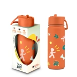Mała butelka na wodę Brosky Wild w kolorze ceglastym z kontrastującym nadrukiem w motyw cętek wyposażona jest w wygodny zamykany ustnik ze słomką oraz zintegrowany uchwyt. Stalowa butelka posiada także podwójne ścianki i ceramiczne wnętrze.