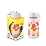 Mała butelka na wodę Brosky Wild w kolorze żółtym z kontrastującym nadrukiem w motyw cętek wyposażona jest w wygodny zamykany ustnik ze słomką oraz zintegrowany uchwyt. Stalowa butelka posiada także podwójne ścianki i ceramiczne wnętrze.