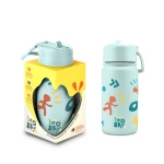 Mała butelka na wodę Brosky Wild w kolorze miętowym z kontrastującym nadrukiem w motyw cętek wyposażona jest w wygodny zamykany ustnik ze słomką oraz zintegrowany uchwyt. Stalowa butelka posiada także podwójne ścianki i ceramiczne wnętrze.