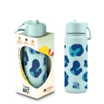 Mała butelka na wodę Brosky Wild w kolorze miętowym z kontrastującym nadrukiem w motyw cętek wyposażona jest w wygodny zamykany ustnik ze słomką oraz zintegrowany uchwyt. Stalowa butelka posiada także podwójne ścianki i ceramiczne wnętrze.
