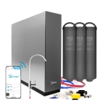 Bezzbiornikowy filtr odwróconej osmozy z mineralizatorem Midea 800GPD Smart RO6 wyróżnia się niewielkim gabarytem, wydajnością filtracyjną do 120 litrów wody na godzinę, modułem WiFi, dedykowaną aplikacją oraz elektronicznym kranikiem z wyświetlaczem.