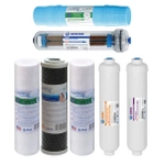 Komplet 6 wkładów do systemu odwróconej osmozy z mineralizatorem i jonizatorem. Pasuje do filtrów Supreme RO7 oraz systemów odwróconej osmozy pozostałych producentów bazujących na wkładach liniowych z przyłączem typu gwint wewnętrzny 1/4 cala.
