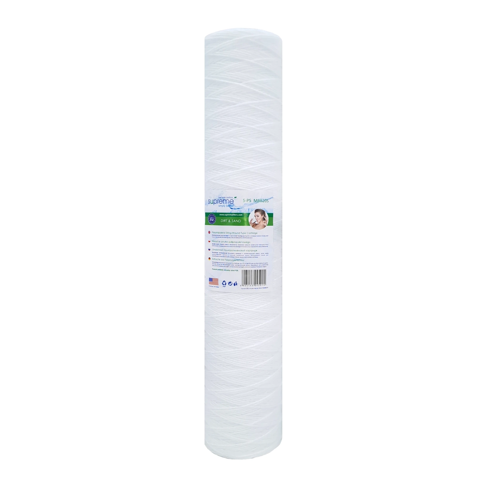 Filtr do wody Supreme S-PS5MBB20S ma kształt walca cylindrycznego. Sznurek polipropyleniowy nawinięty jest wokół rdzenia. S-PS5MBB20S filtruje wodę od zewnątrz do wewnątrz swojej powierzchni. Jego gęstość rośnie w kierunku rdzenia filtra. Dzięki temu okres działania filtra jest wydłużony do maksimum. Filtr wykonany został ze sznurka polipropylenowego. Filtr do wody S-PS5MBB20S stosuje się w standardowych filtrach wody narurowych. Skutecznie chroni pozostałe, zwykle droższe elementy systemu filtracji.