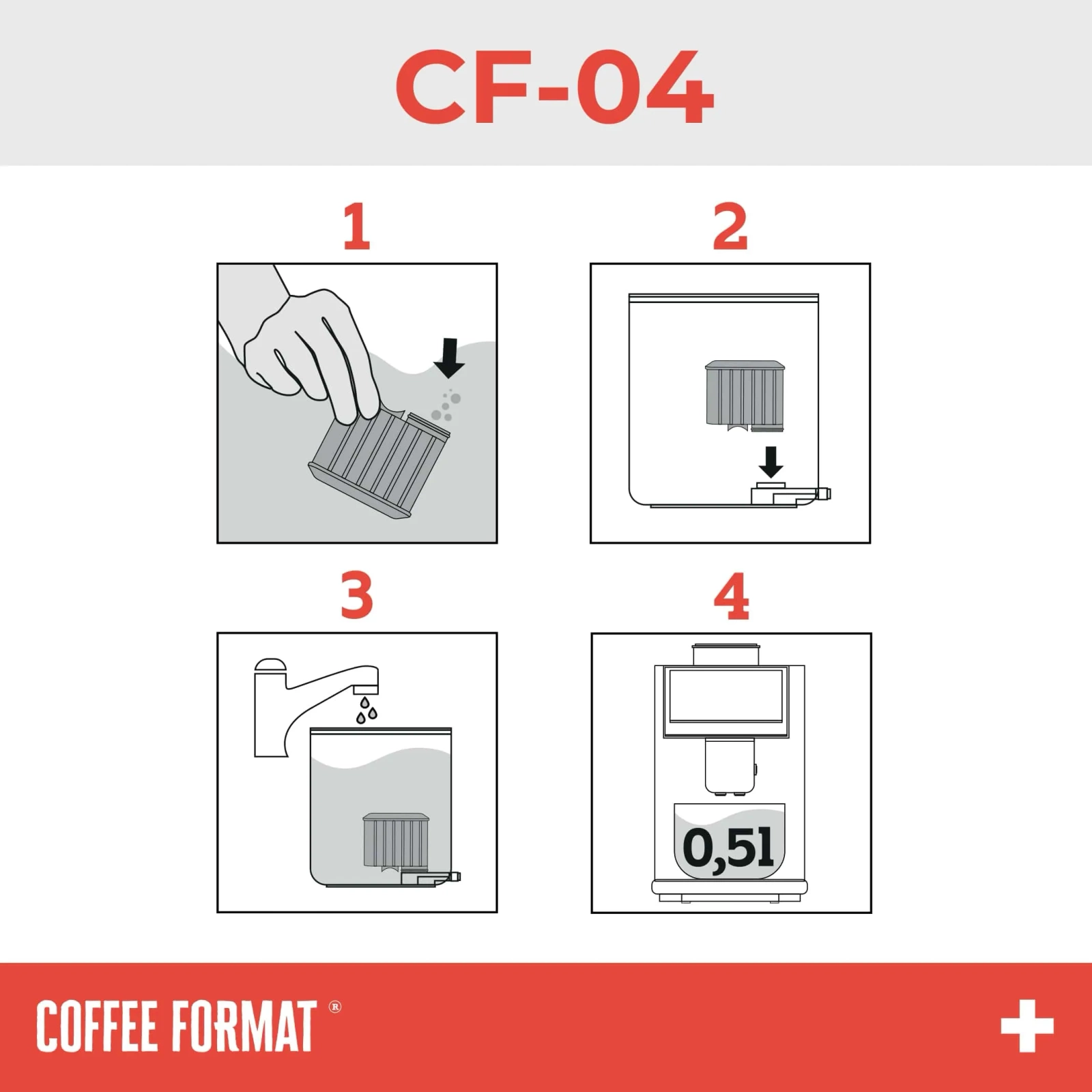 Wkład filtrujący wodę CF-04 dedykowany jest do ekspresów do kawy Philips i Saeco, które wykorzystują filtry AquaClean. Zbudowany z drobnego oraz wydajnego węgla aktywnego usuwa z wody zanieczyszczenia mechaniczne takie jak rdza, piasek, muł oraz poprawia smak i zapach filtrowanej cieczy. Charakterystyczną cechą wkładu filtrującego Coffee Format jest zwiększona wydajność filtracji, wysoka jakość wykorzystanych do produkcji materiałów i idealne dopasowanie.