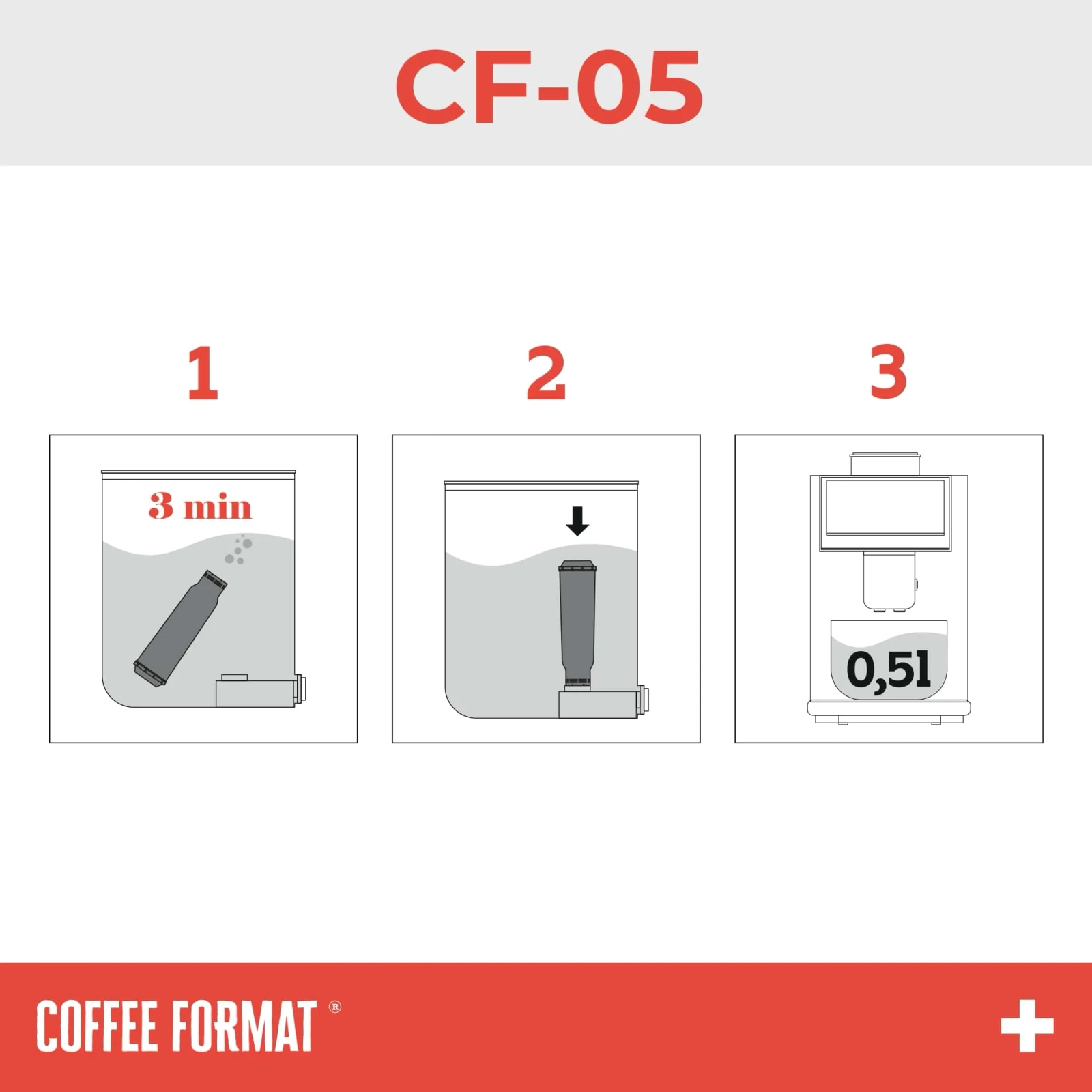 Filtr CF-05 odpowiada za stały dostęp do przefiltrowanej wody używanej w ekspresach do kawy. Wkład usuwa zanieczyszczenia mechaniczne tj. piasek, rdza, oraz pozostałe zanieczyszczenia znajdujące się w wodzie sieciowej, poprawia również walory wody — smak oraz zapach. Wkład wykonany został z dobrej jakości materiałów, które gwarantują kompatybilność z wieloma modelami urządzeń oraz idealne dopasowanie odpowiadające oryginalnym filtrom wody. Za dokładność filtracji odpowiada złoże wysokojakościowego węgla aktywnego, które powszechnie wykorzystane jest do filtracji wody np. w butelkach lub dzbankach filtrujących. Filtr Coffee Format CF-05 jest odpowiednikiem wkładów Claris White, które wykorzystywane są w wielu ekspresach firm takich jak: Jura, Bosch, Gaggenau, Krups, Melitta, Nivona, Neff czy Siemens.