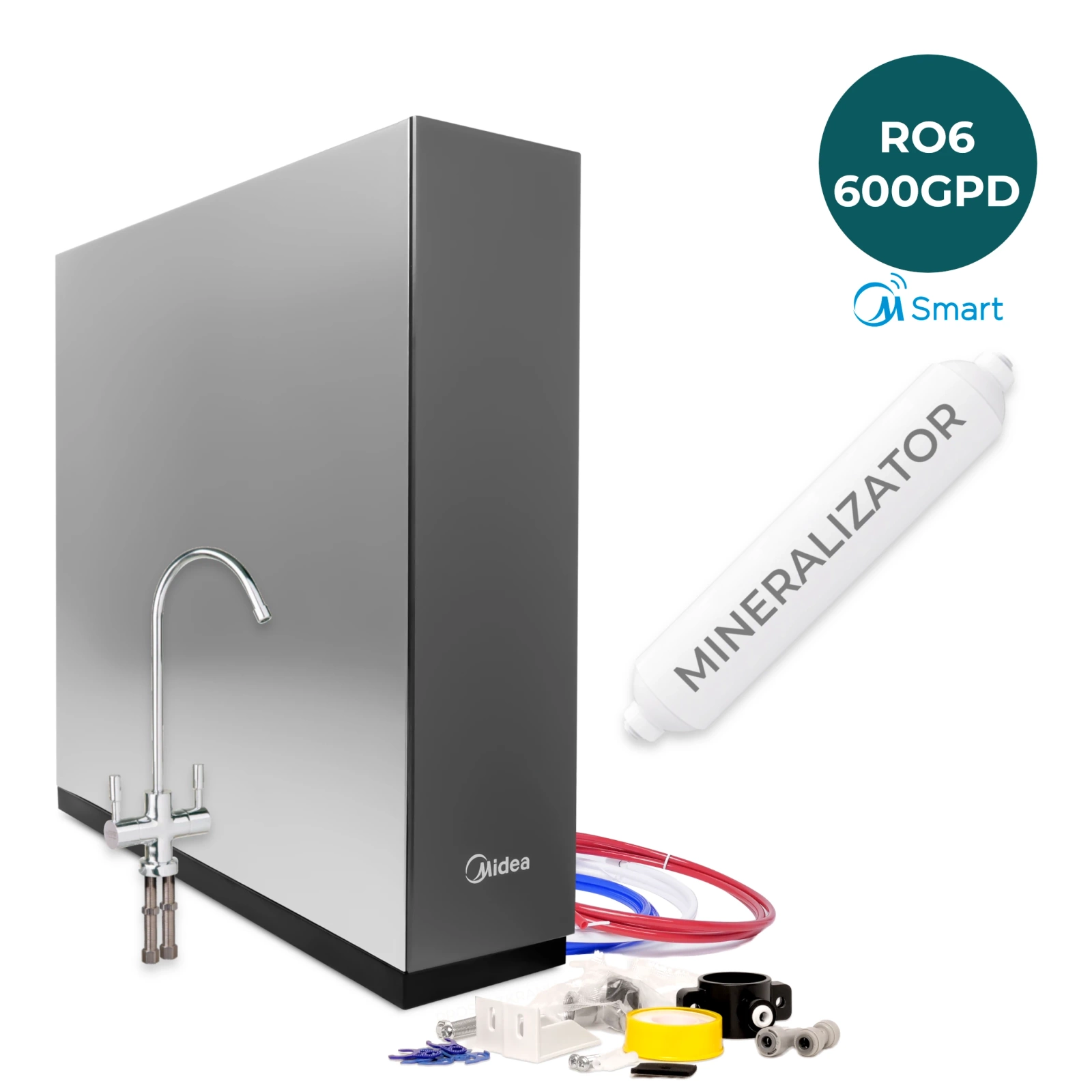 Filtr osmotyczny Midea 600GPD to nowoczesne urządzenie o kompaktowym gabarycie i ogromnych możliwościach filtracyjnych. System wykorzystuje dwie membrany osmotyczne o wydajności 300GPD każda oraz hybrydowy wkład PCB, które gwarantują dokładny proces filtracji dostarczający idealnie czystą wodę w kuchni. Filtr Midea pozbawiony jest zewnętrznego zbiornika wody, a jego konstrukcja została zaprojektowana tak, aby montaż był możliwy nie tylko pod zlewozmywakiem, ale także pod większością szafek kuchennych (w tzw. cokole szafki). Odwrócona osmoza Midea 600GPD wyposażona jest w moduł WiFi i dedykowaną aplikację, która ułatwia monitorowanie jakości wody, stanu wkładów oraz informuje o konieczności przeprowadzenia czynności serwisowych.