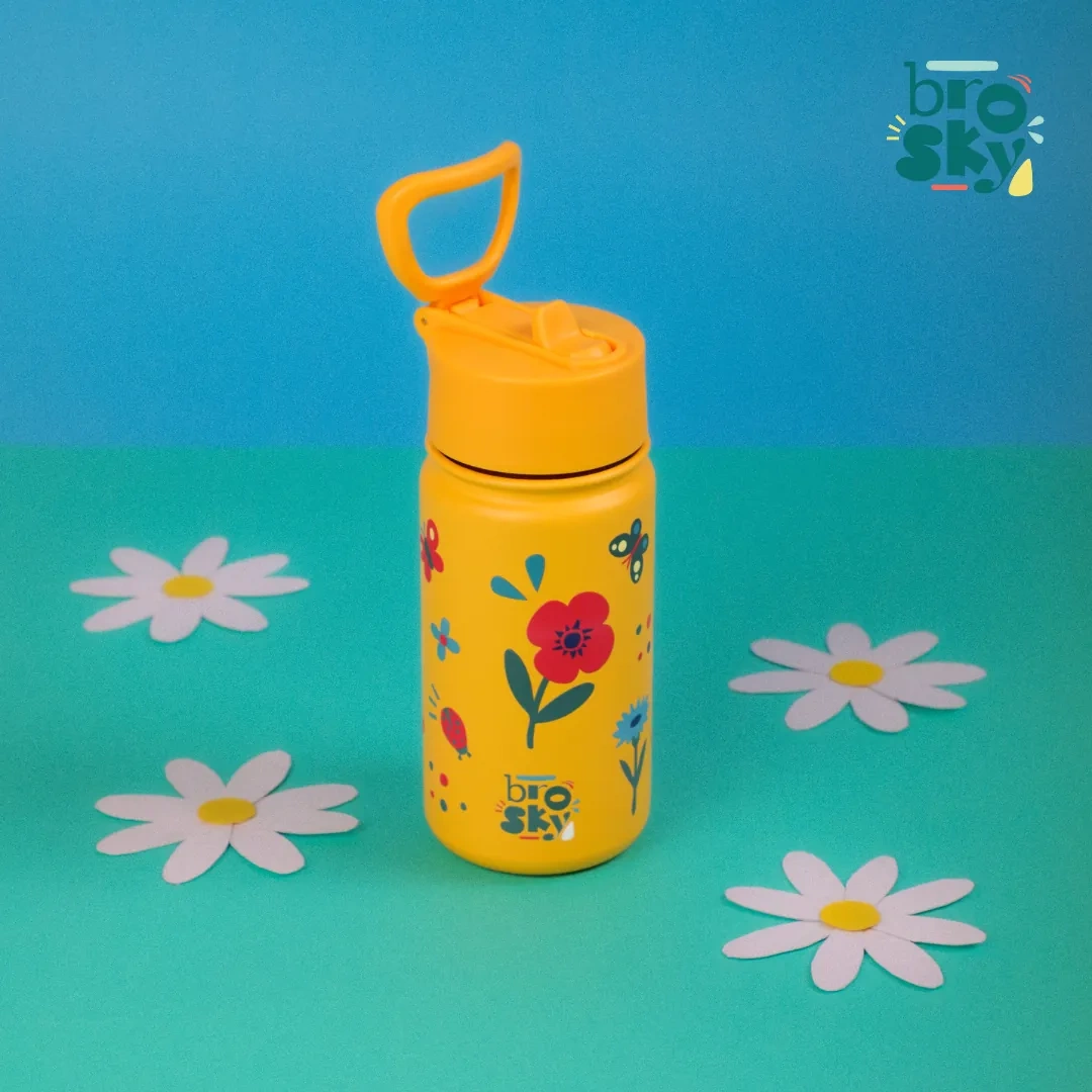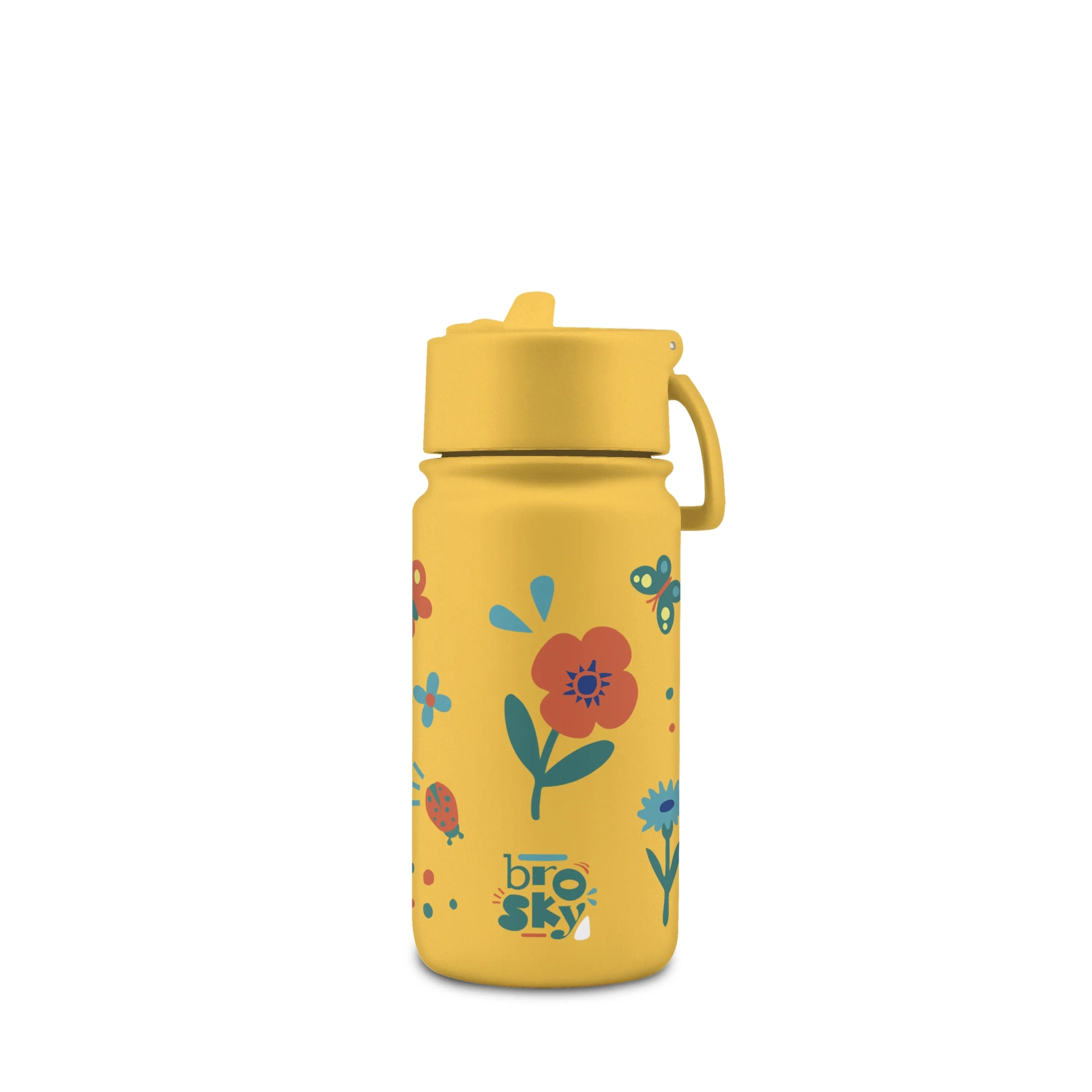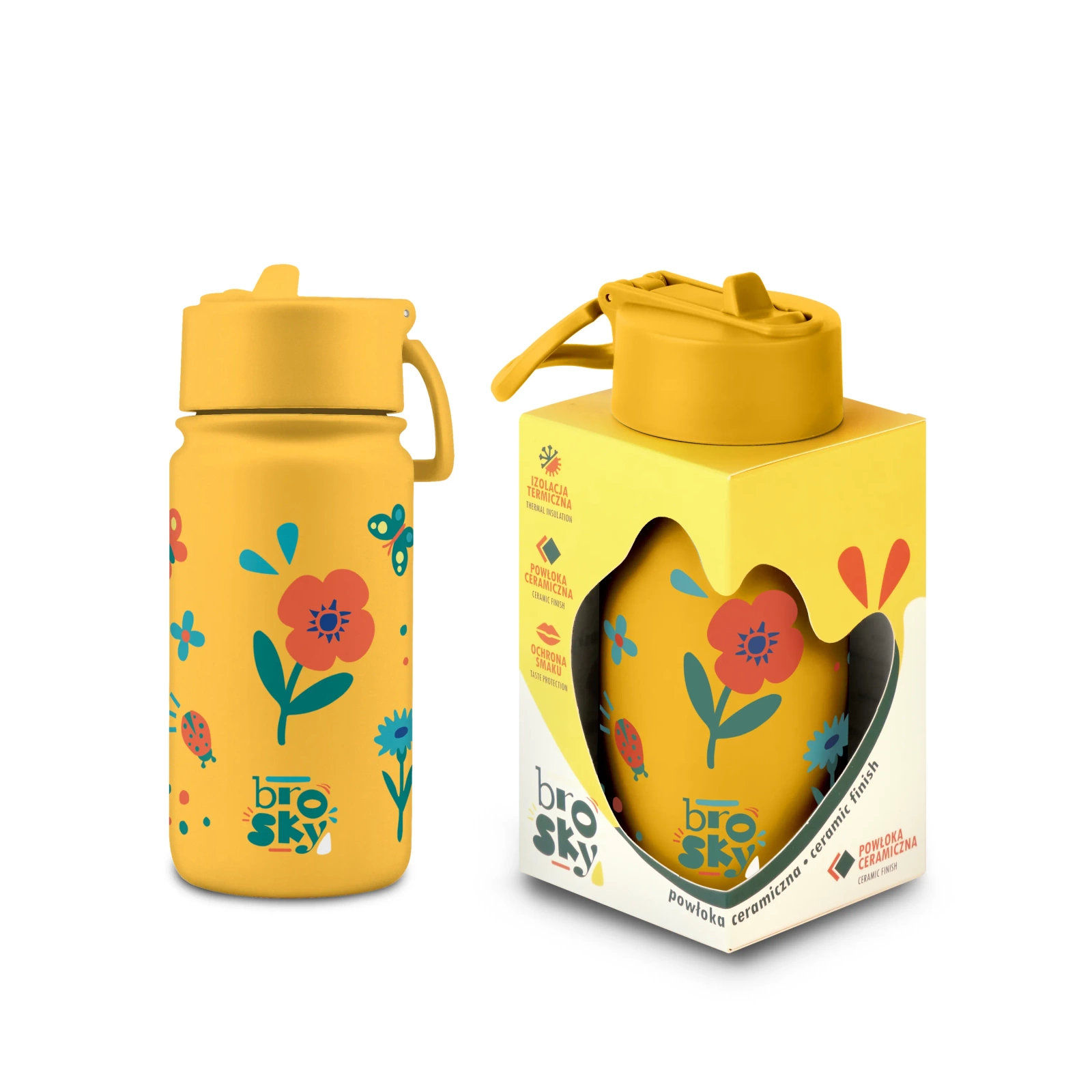 Stalowy bidon na wodę dla dzieci Brosky Kids w kolorze żółtym w kwiaty i owady o pojemności 450 ml