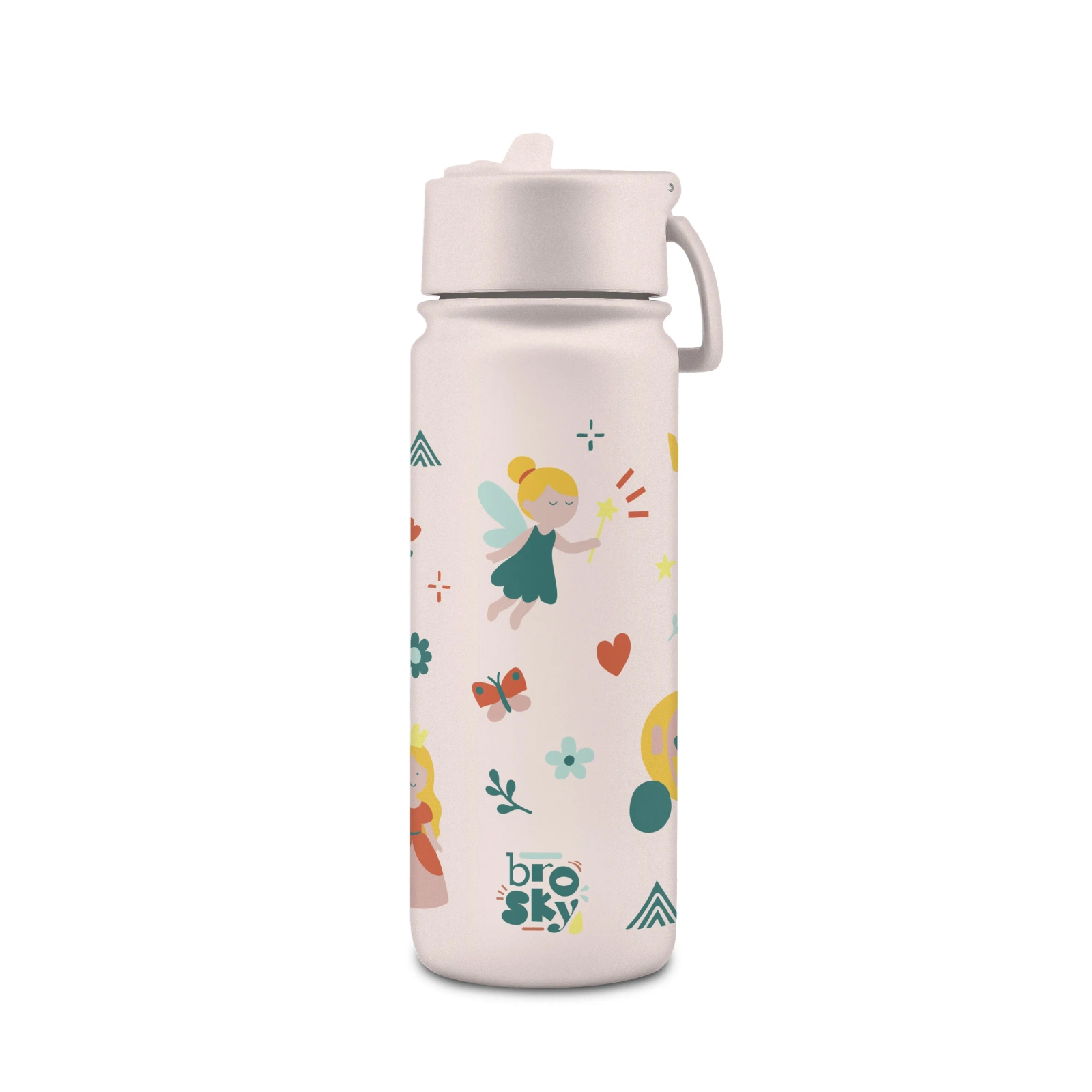 Stalowy bidon na wodę dla dzieci Brosky Kids w kolorze różowym we wróżki i księżniczki o pojemności 550 ml