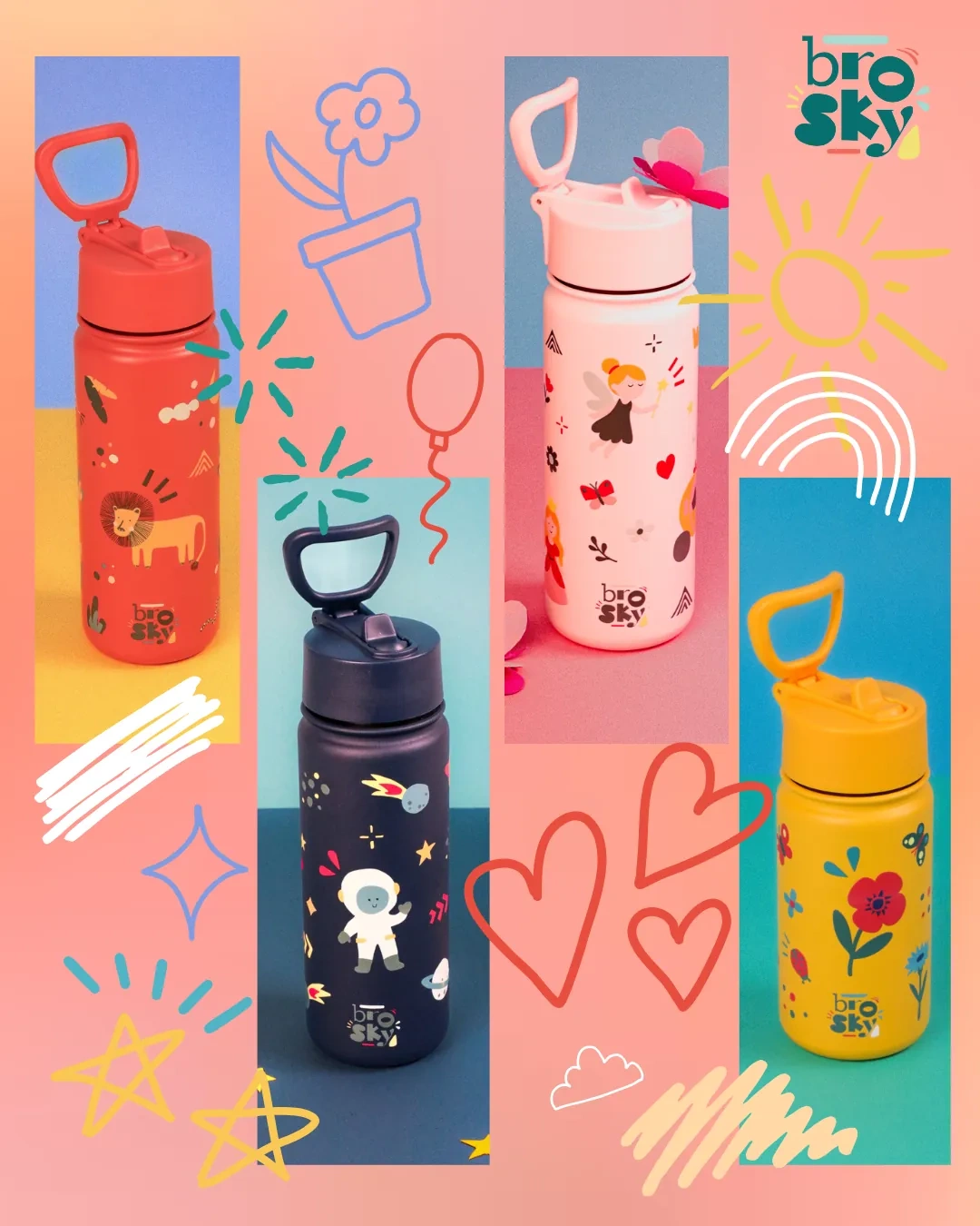 Butelki termiczne Brosky Kids dostępne są w wielu kolorach i wzorach dopasowanych do upodobań najmłodszych!
