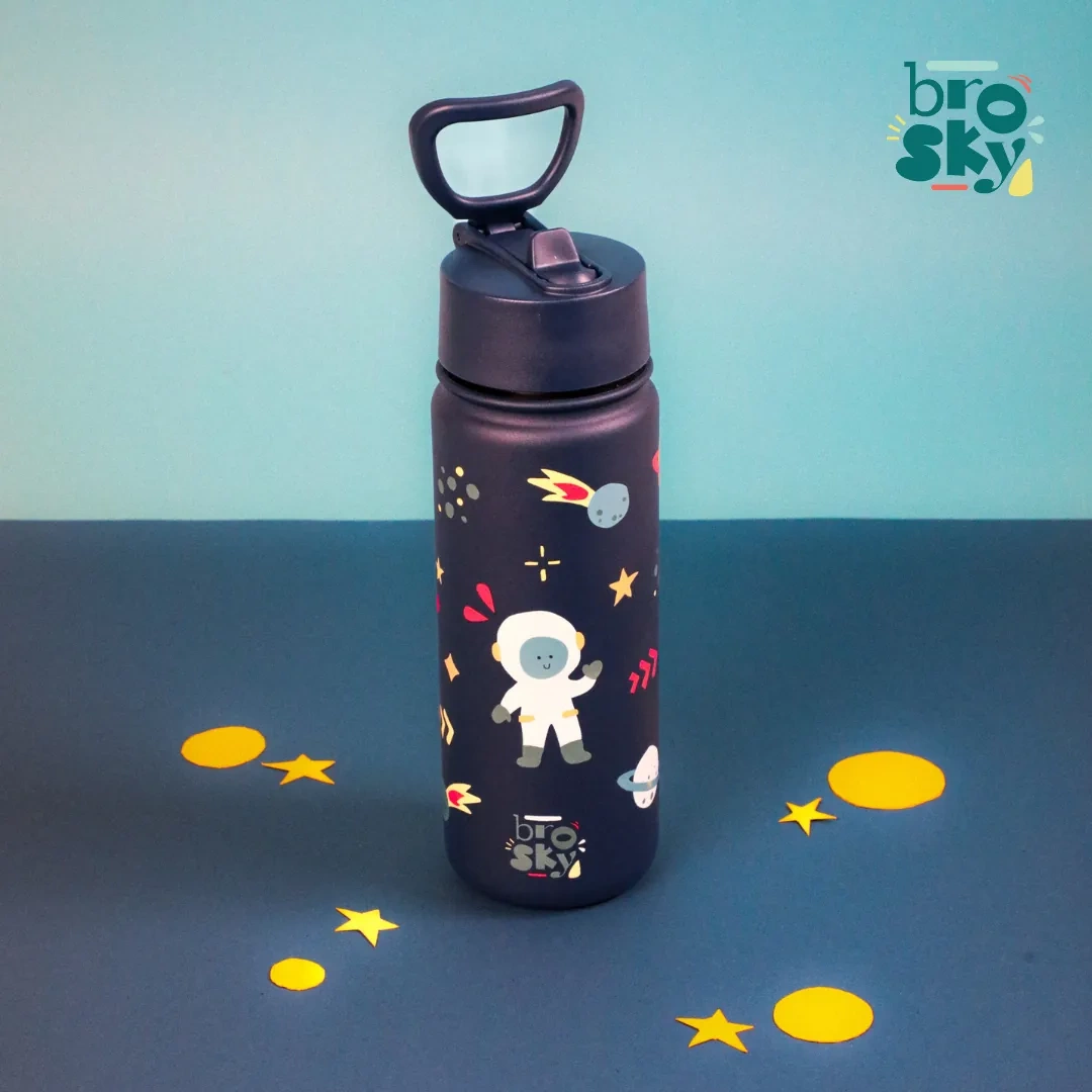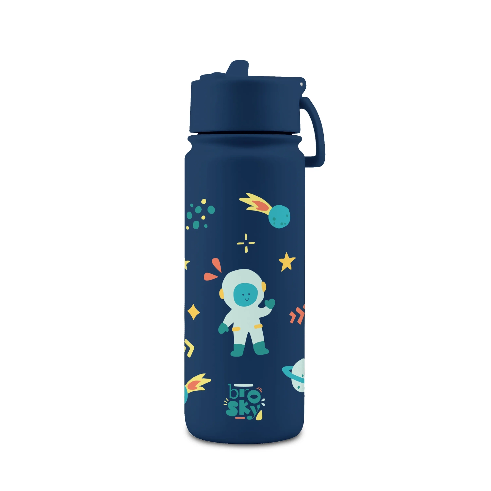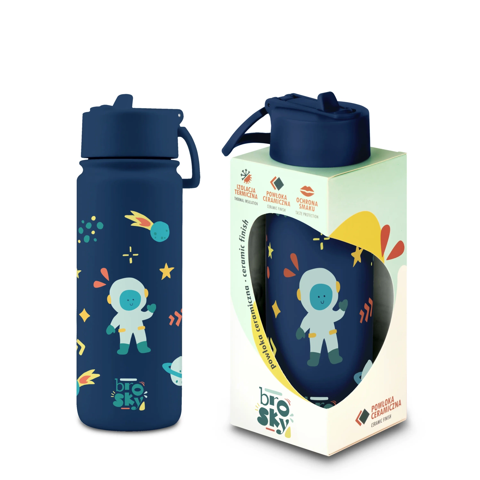 Stalowy bidon na wodę dla dzieci Brosky Kids w kolorze ciemnoniebieskim w motyw kosmosu i astronauty o pojemności 550 ml