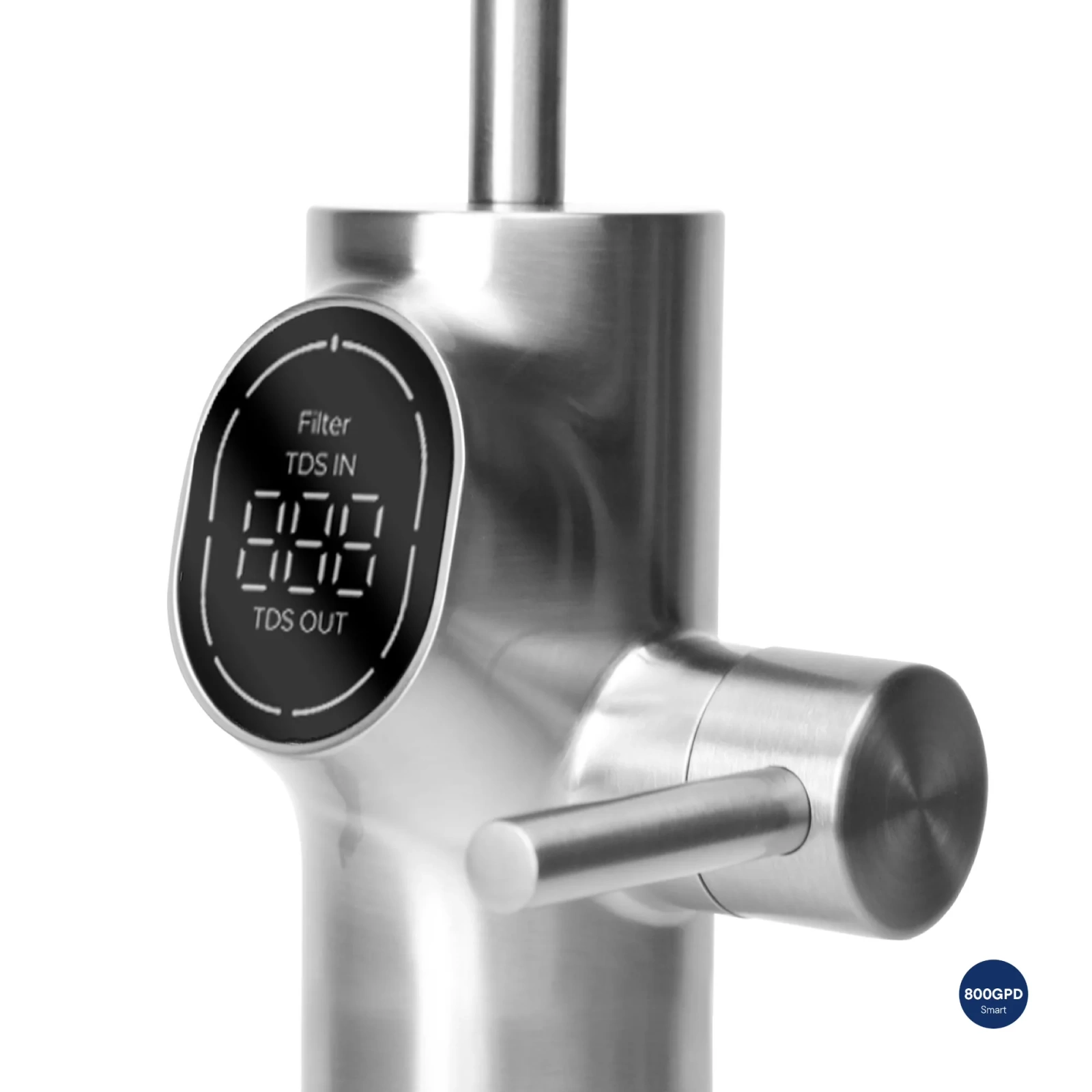 W zestawie z filtrem dostarczany jest także elektroniczny kranik z wyświetlaczem, na którym wyświetlane są parametry wody. Stały podgląd poziomu TDS wody filtrowanej, sygnalizacja poziomu zużycia i konieczności wymiany wkładów filtrujących dostarcza poczucia bezpieczeństwa oraz podnosi komfort użytkowy.