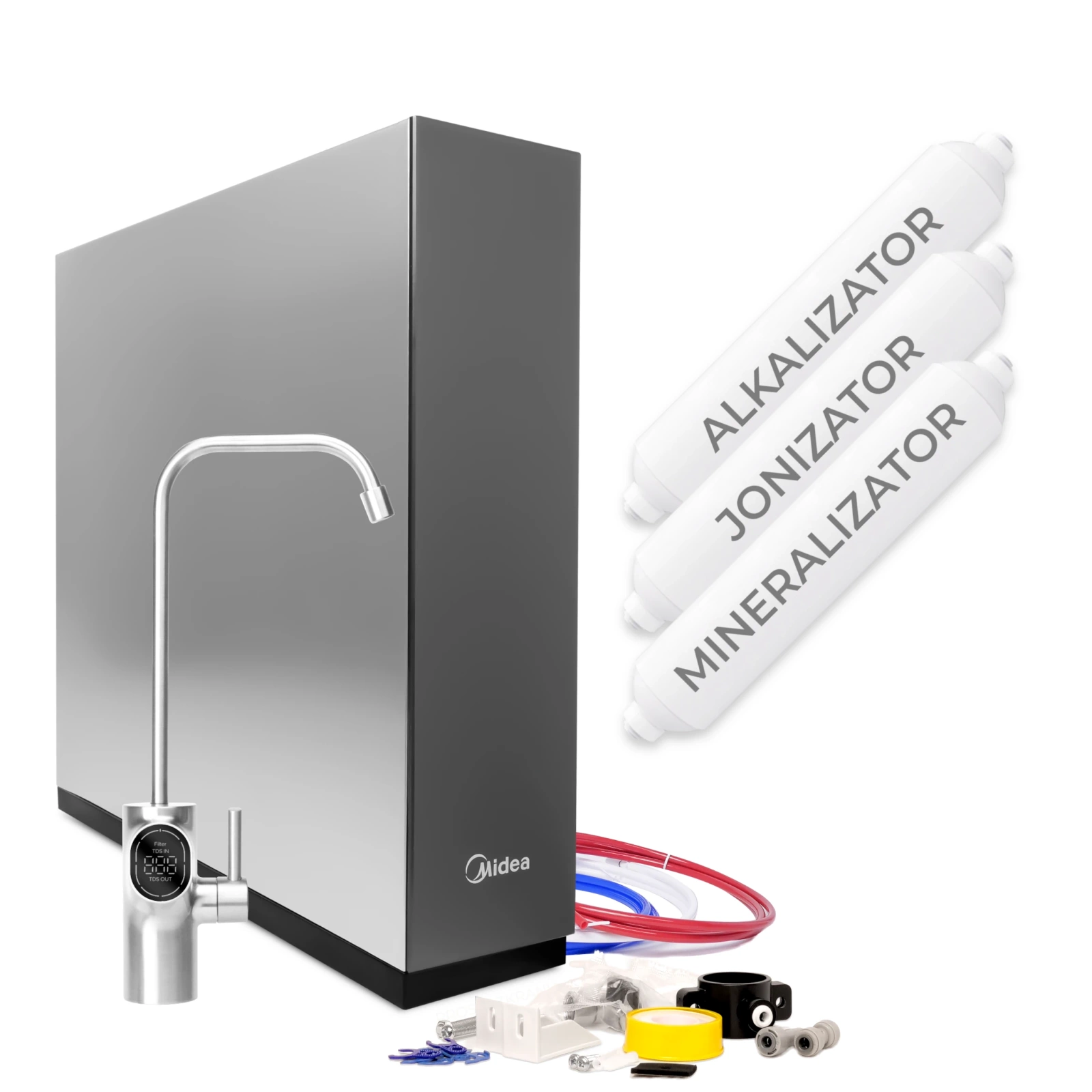 Filtr Midea w rozbudowanej konfiguracji jest dostarczany z mineralizatorem wody, wkładem bioceramicznym oraz alkalizatorem. Mineralizator przywraca oczyszczonej wodzie niezbędne minerały tj. magnez, wapń, sód i potas, wkład bioceramiczny poddaje wodę korzystnemu promieniowaniu FIR, a ostatni wkład alkalizujący podnosi pH wody oraz obniża ORP wody. Ilość przywróconych pierwiastków jest raczej niewielka, a podstawowym źródłem minerałów jest odpowiednia dieta.